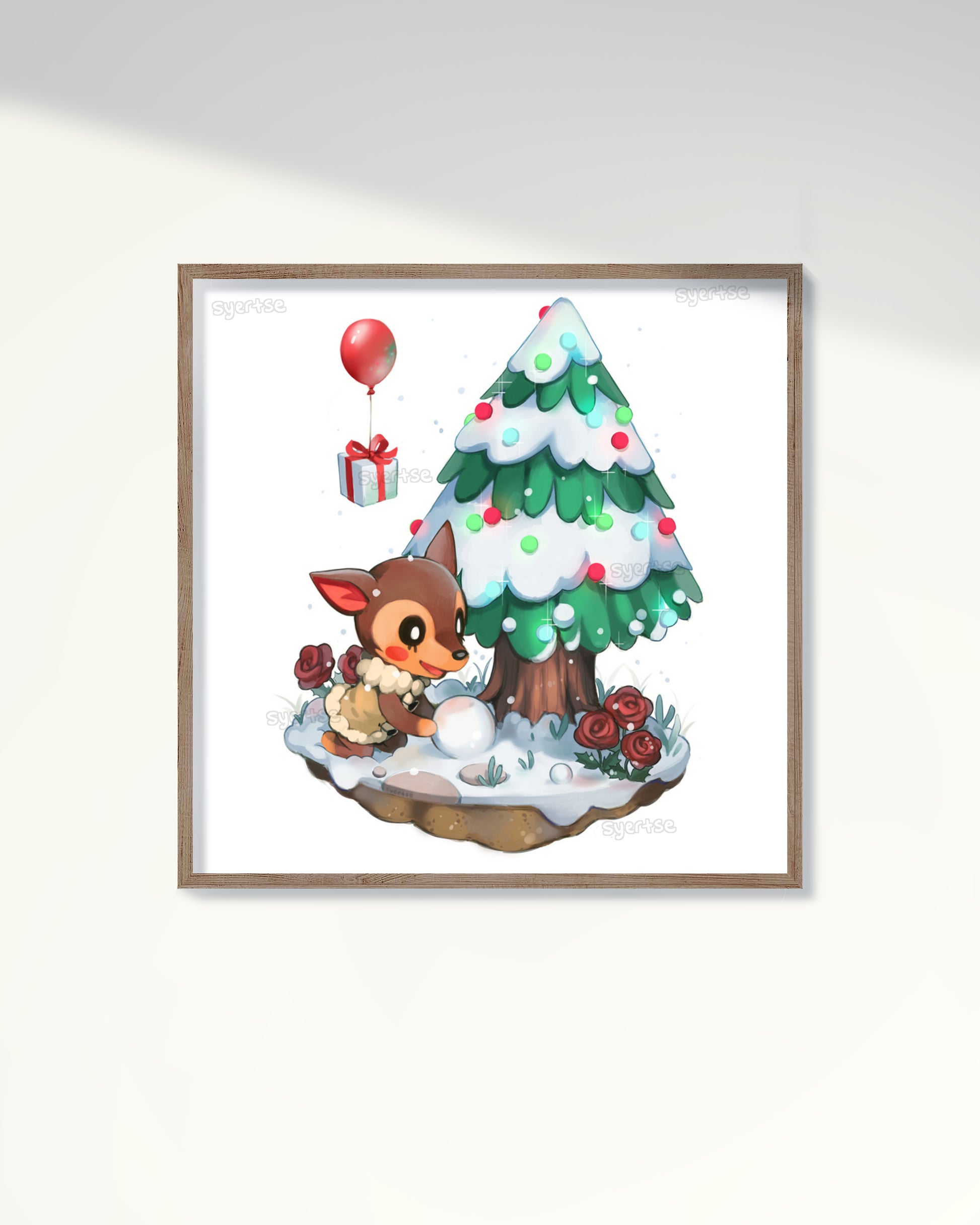 A print of Fauna the villager making a snowball under a tree during the winter season!