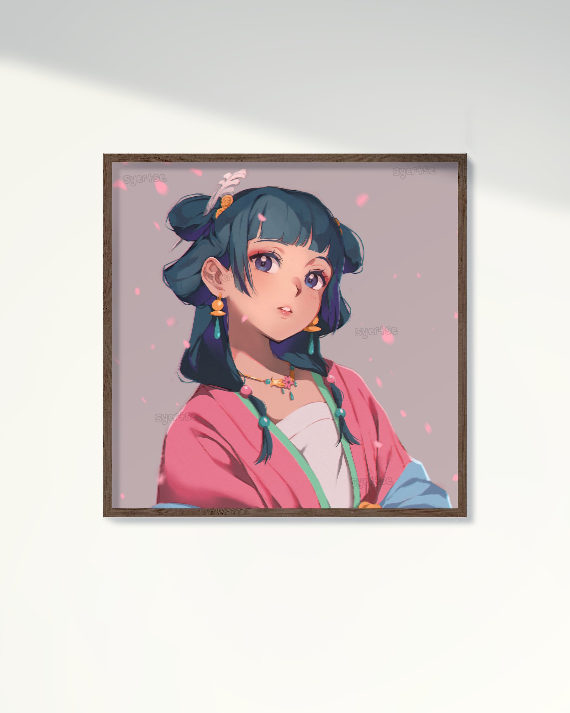 A print of Maomao the apothecary during one of the rare times she is dressed up for an event. She is wearing a hairpin that was gifted to her by someone special.
