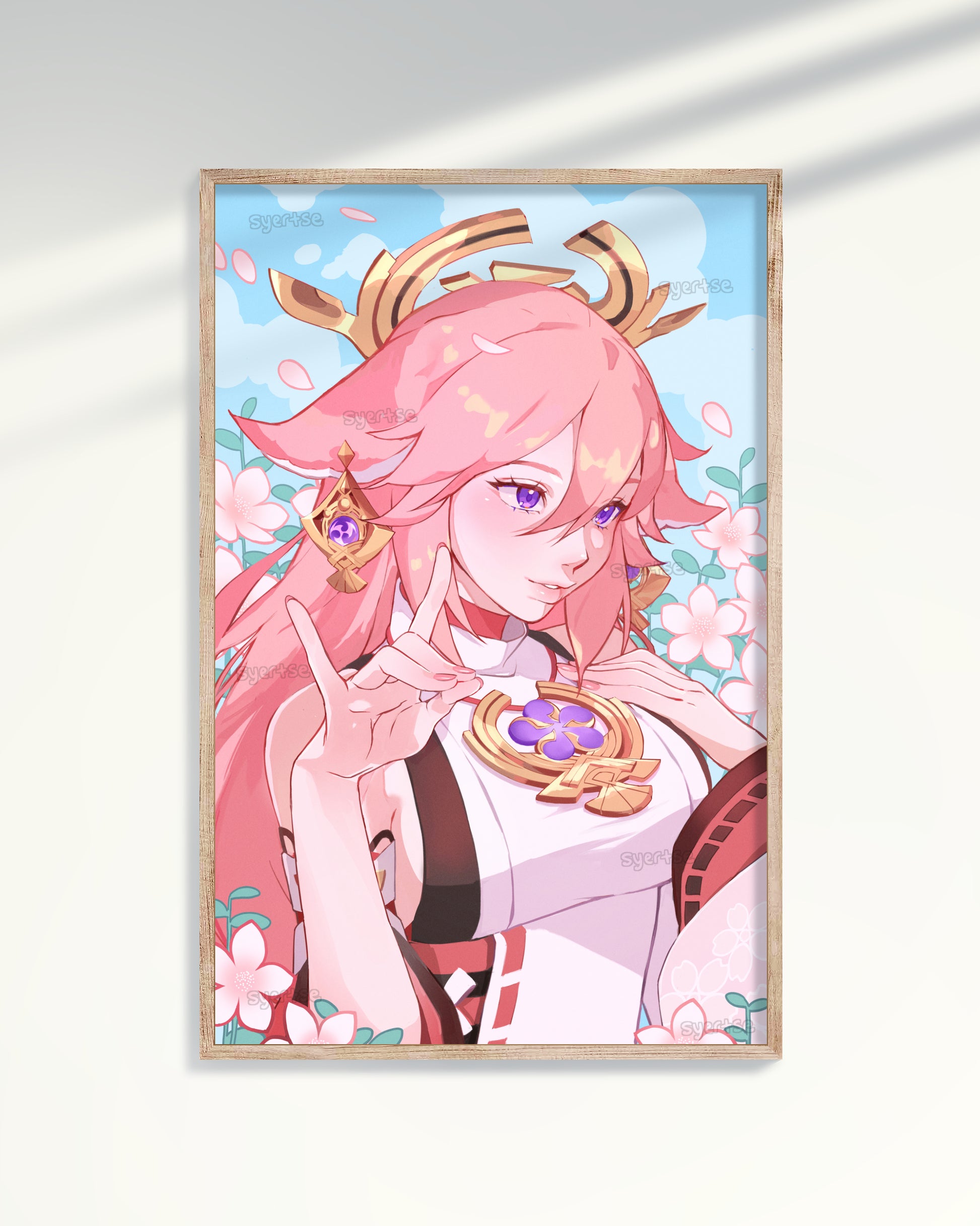 A print of Yae Miko making the fox symbol with her hand while being surrounded by flowers.
